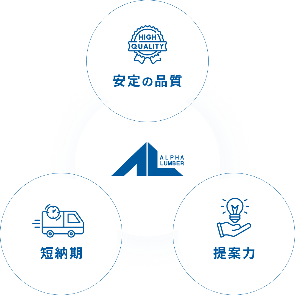 アルファランバーは様々なお客様のご要望にお応えするため、提携先のプレカット工場とシームレスな連携体制を整えております。加えて、特殊加工などのご要望は自社工場内で職人によるプレカットにも対応しております。専門のスタッフがお客様のご要望に応じてご提案させていただきます。