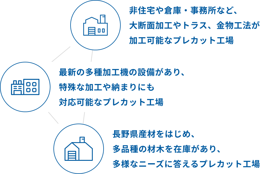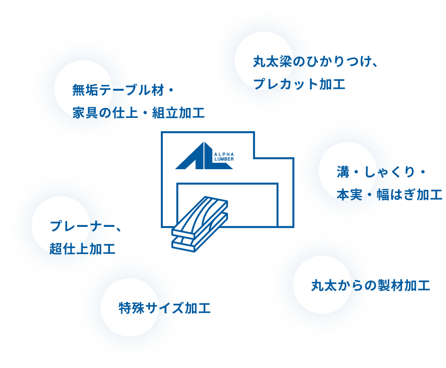 アルファランバーは様々なお客様のご要望にお応えするため、提携先のプレカット工場とシームレスな連携体制を整えております。加えて、特殊加工などのご要望は自社工場内で職人によるプレカットにも対応しております。専門のスタッフがお客様のご要望に応じてご提案させていただきます。